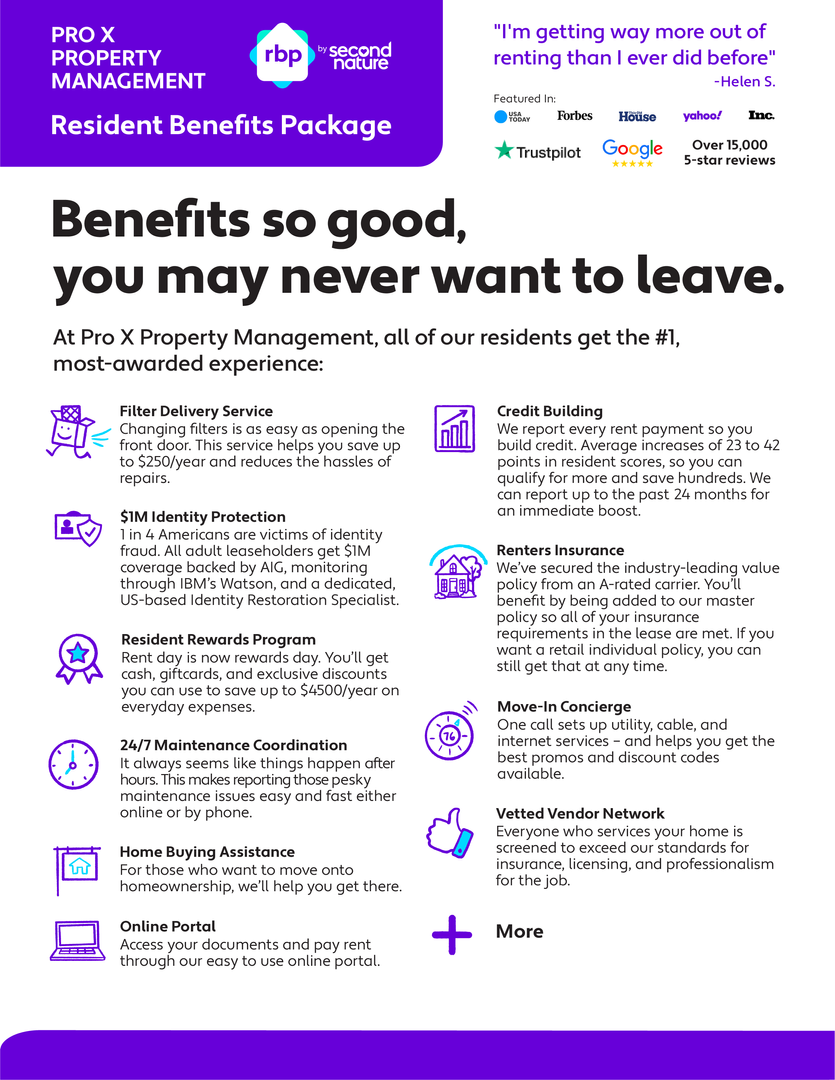 All Pro X Property Management residents are enrolled in the Resident Benefits Package (RBP) for $40.00/month which includes renters insurance, HVAC air filter delivery (for applicable properties), credit building to help boost your credit score with timely rent payments, $1M Identity Protection, our best-in-class resident rewards program, and much more! Renter’s insurance is a requirement to rent from Pro X.